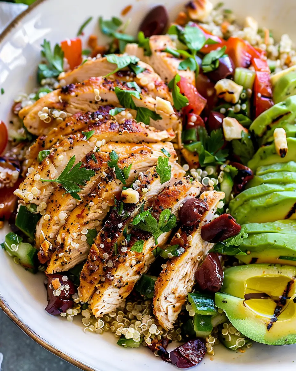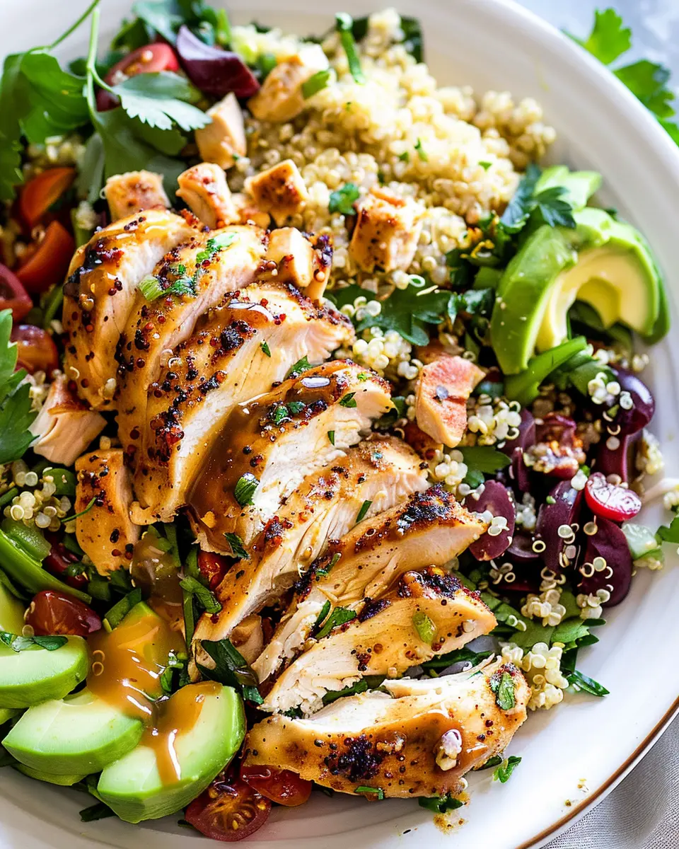 This 10-Minute Chicken and Quinoa Salad is a quick and healthy meal that combines protein-rich chicken and nutritious quinoa, topped with fresh vegetables and a light dressing.