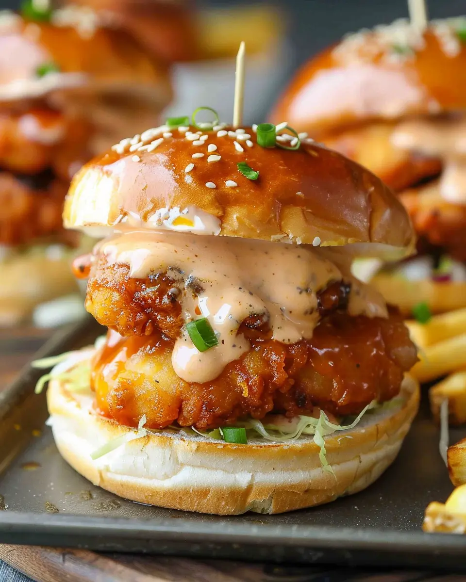 • Layering: Slice the buns in half, place a piece of fried chicken on the bottom half, drizzle with the bang bang sauce, and top with your favorite garnishes—think coleslaw for crunch or pickles for tang.