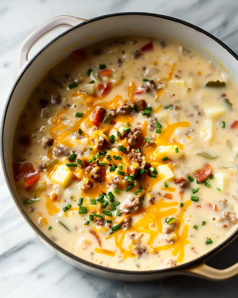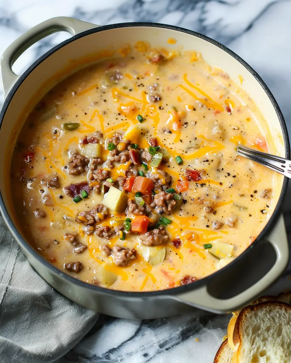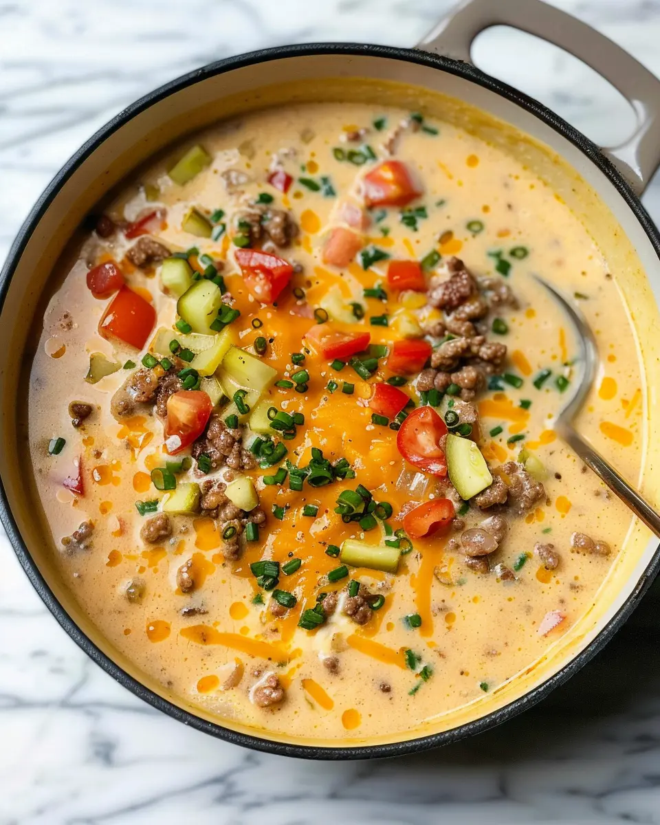 A deliciously creamy and comforting cheeseburger soup that’s perfect for any occasion.