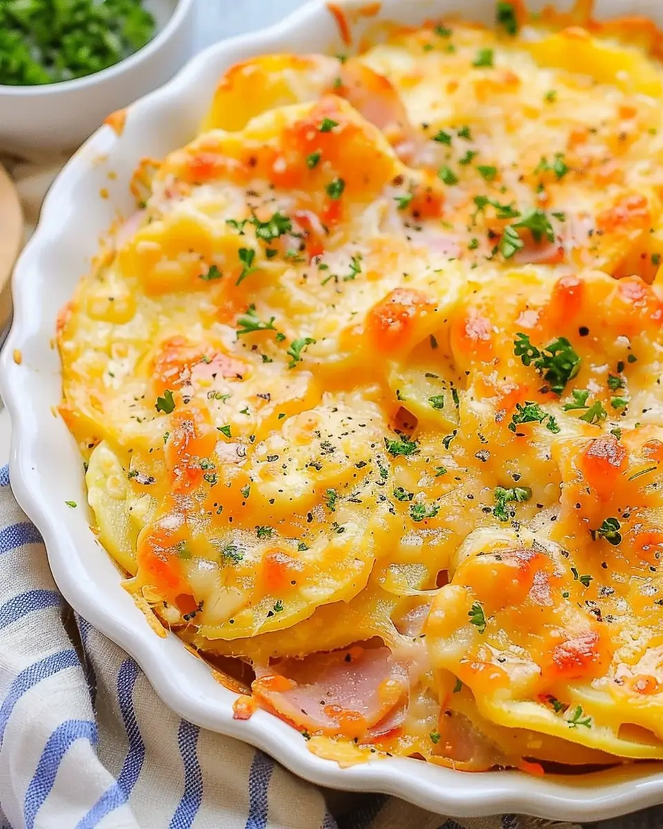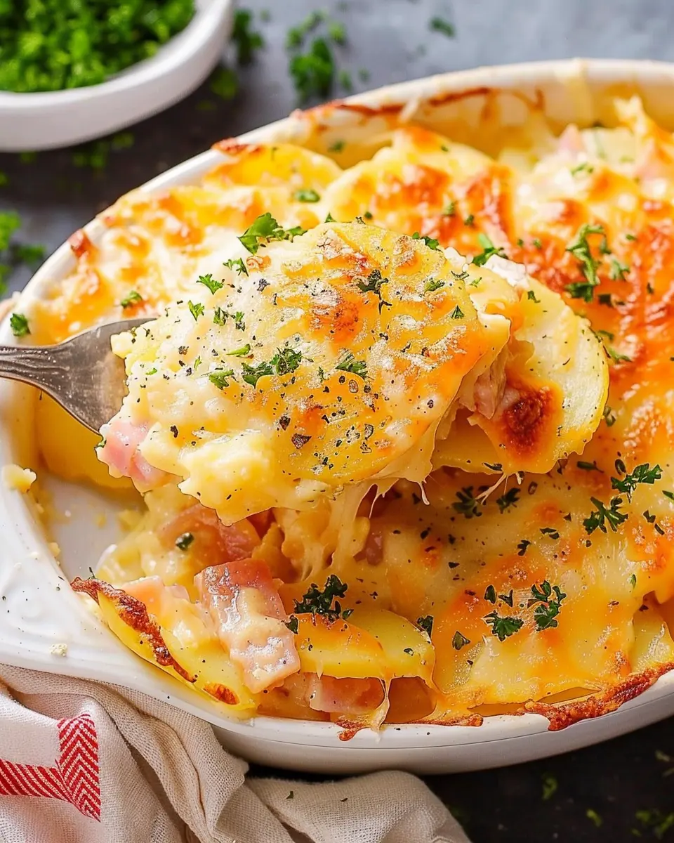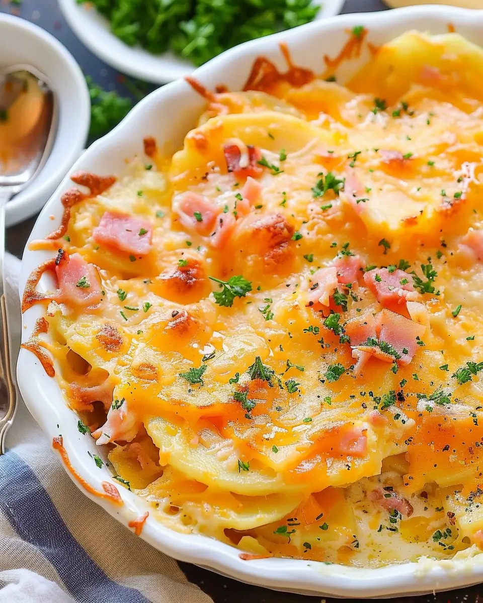 Home » Recipes » Cheesy Scalloped Potatoes with Chicken Ham: An Indulgent Twist