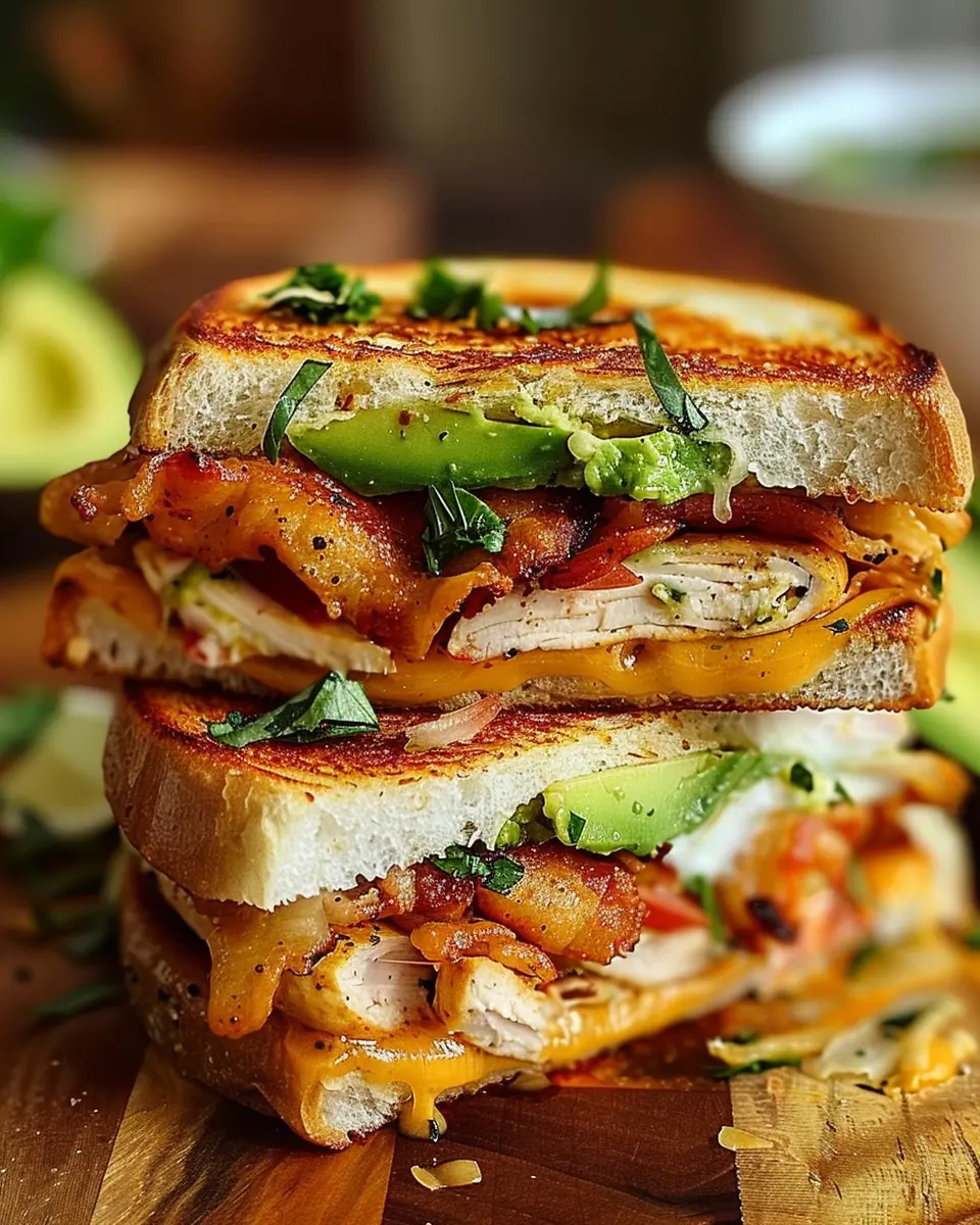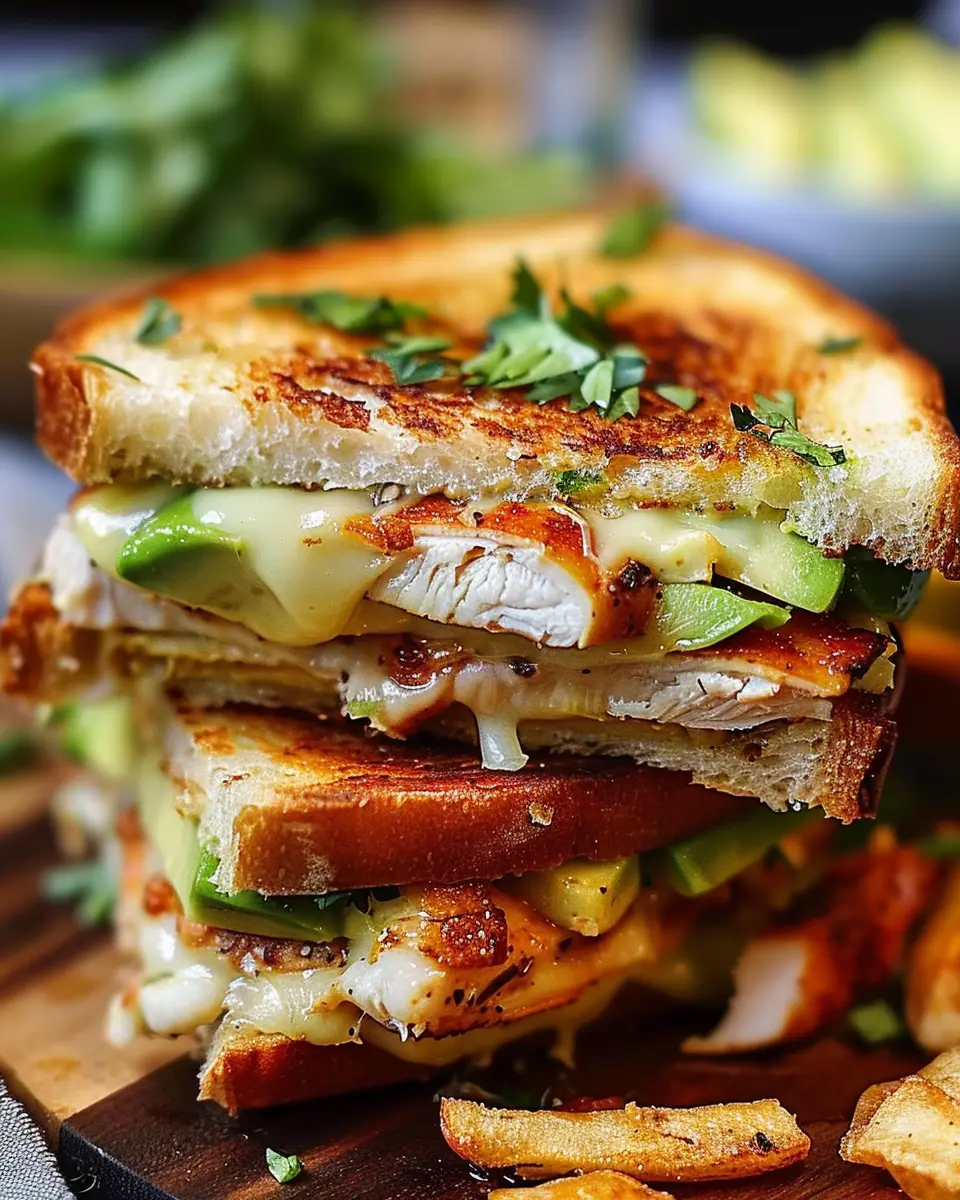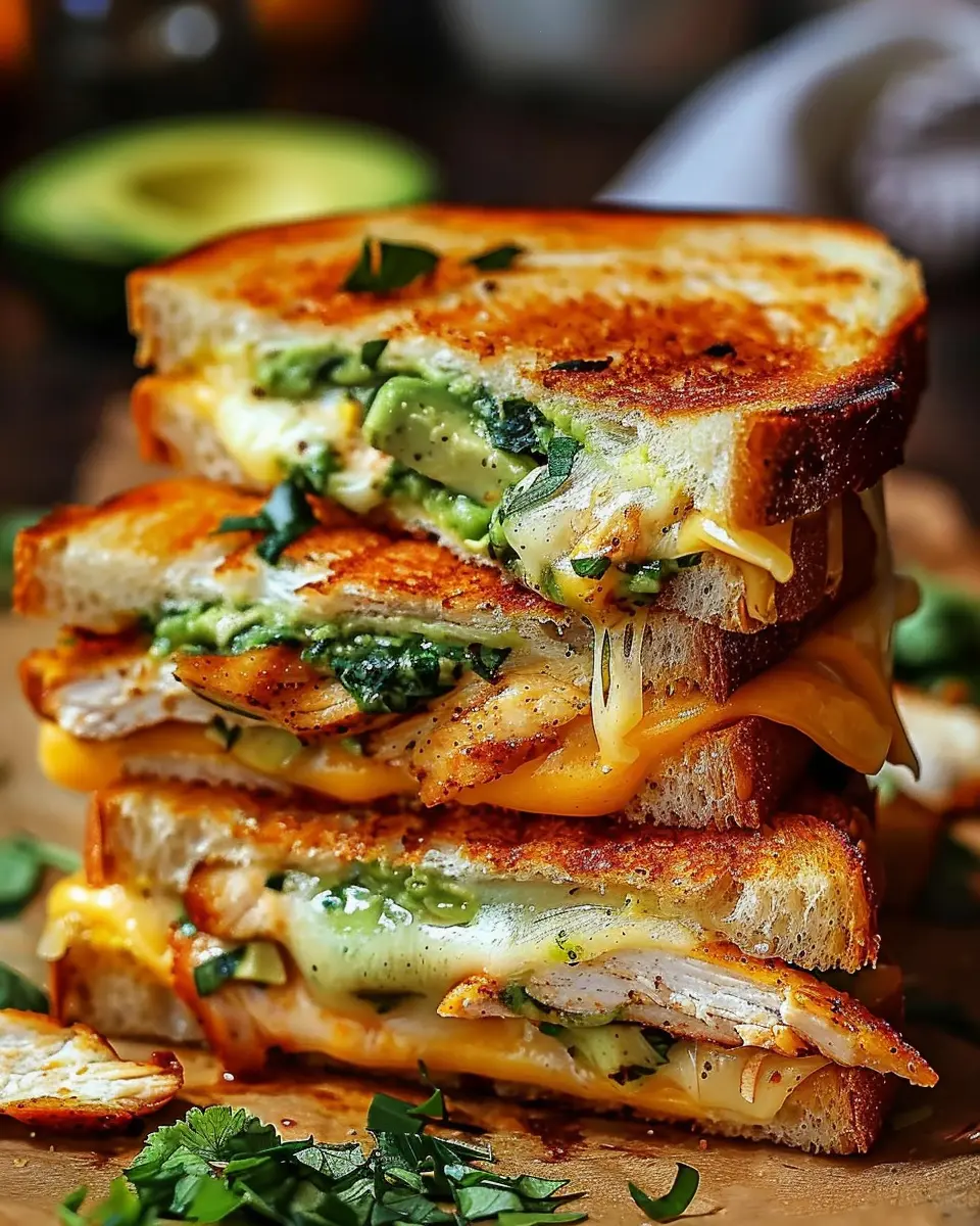 A delicious blend of grilled chicken, creamy avocado, and melted cheese, all piled high on toasted bread for a satisfying meal.