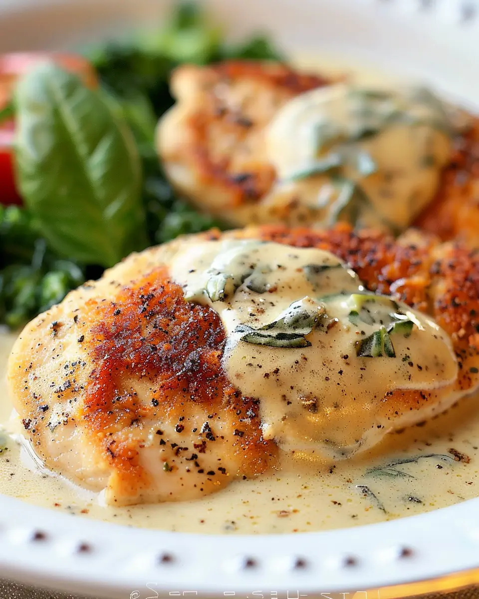 Indulge in this rich and creamy Chicken In Basil Cream Sauce recipe, perfect for a comforting meal.