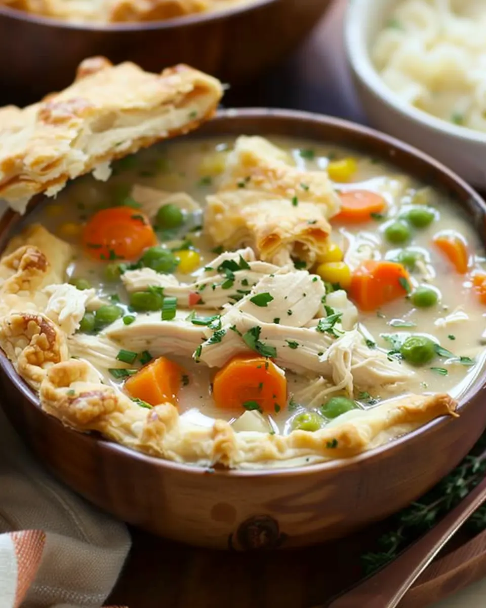 A delightful and hearty soup that combines the comforting flavors of chicken pot pie in a warm and inviting bowl.