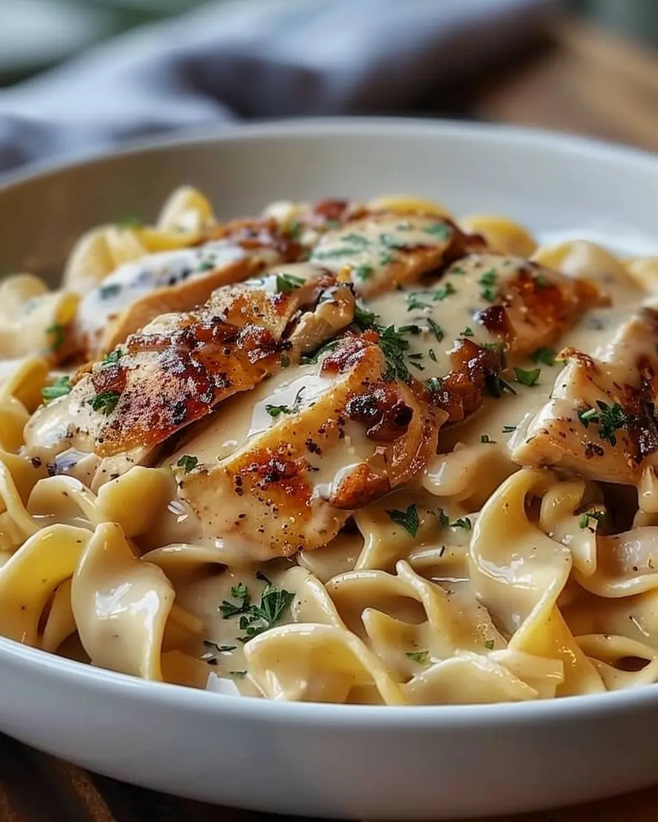 • Plate It Up: Slice your cooked chicken and place it over the buttery noodles. Drizzle the creamy mushroom sauce generously on top.