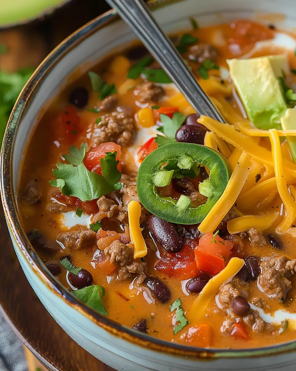 If you love a little heat, why not spice things up? Adding extra jalapeños, either fresh or pickled, can take your creamy beef taco soup to new fiery heights. You can sauté them along with your onions and garlic for an extra layer of flavor before adding the beef. Additionally, a few dashes of your favorite hot sauce can personalize your soup with just the right kick. For those who want a milder version, always keep the heat on the side so everyone can customize their own bowl.
