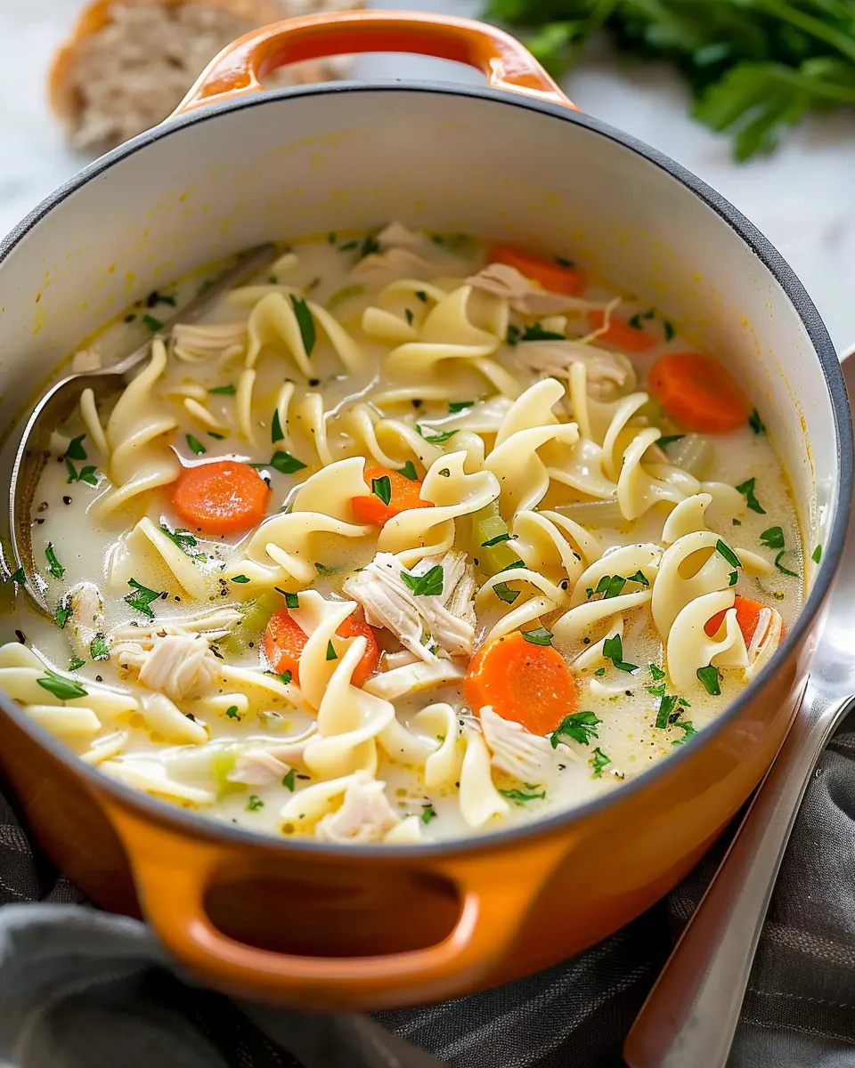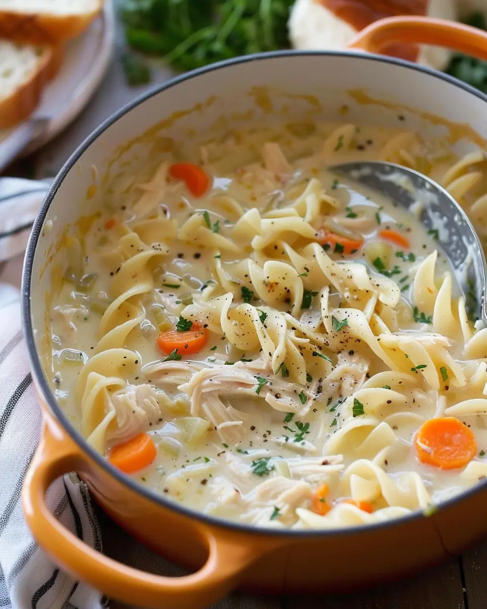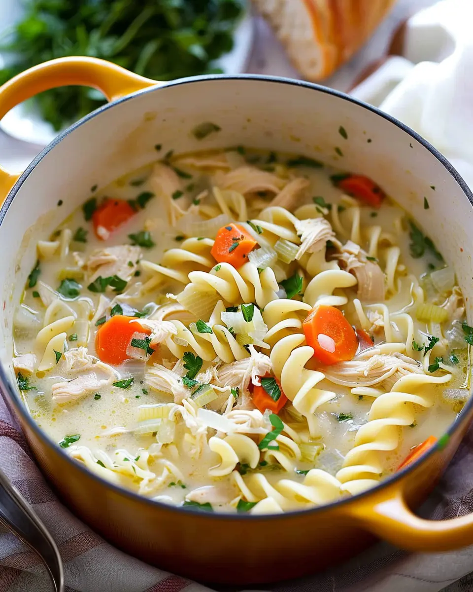 Your creamy chicken noodle soup is now ready to serve! Ladle it into bowls and garnish with fresh parsley if desired. Don’t forget to toast some crusty bread on the side—it’s the perfect companion for scooping up that creamy goodness.