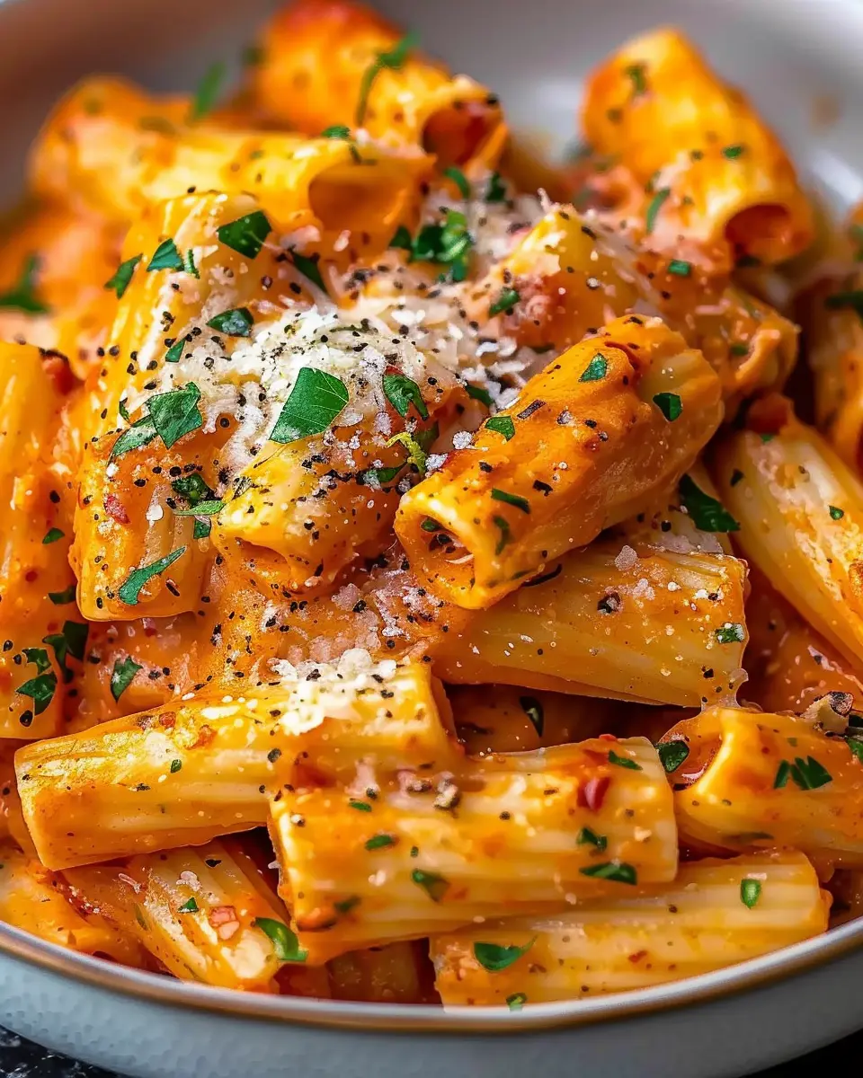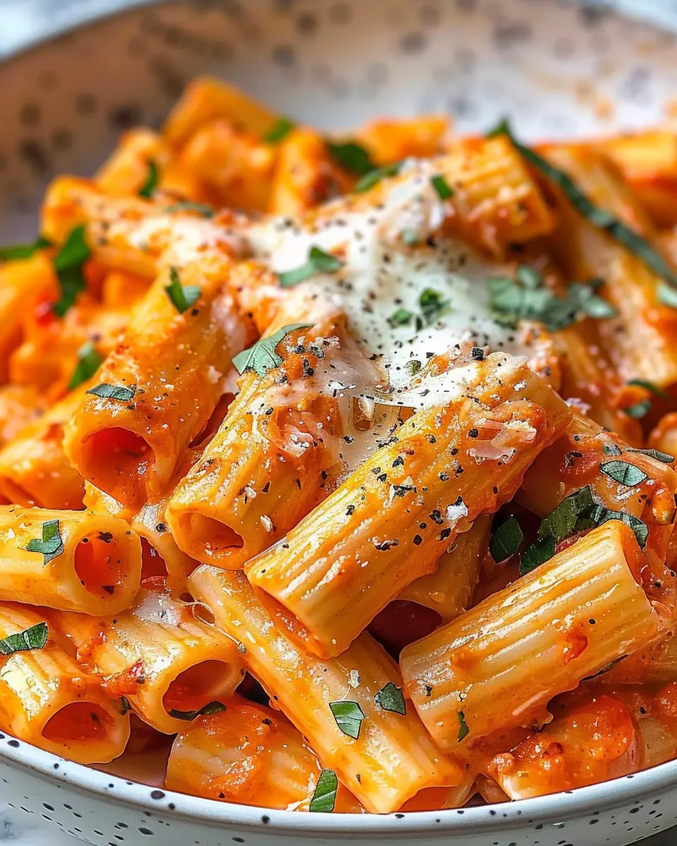 A delightful creamy tomato garlic rigatoni pasta that is both easy to make and indulgent in flavor.