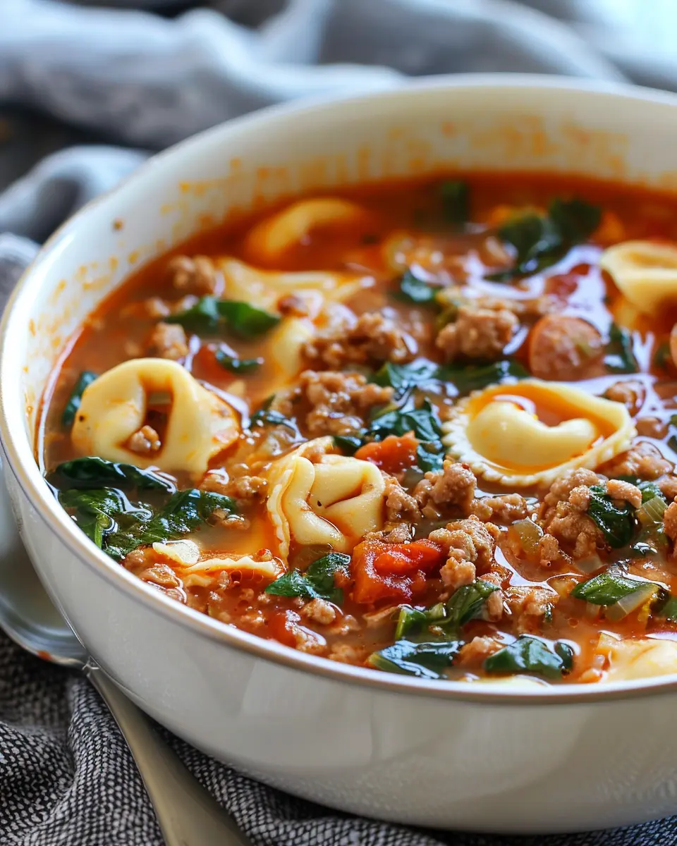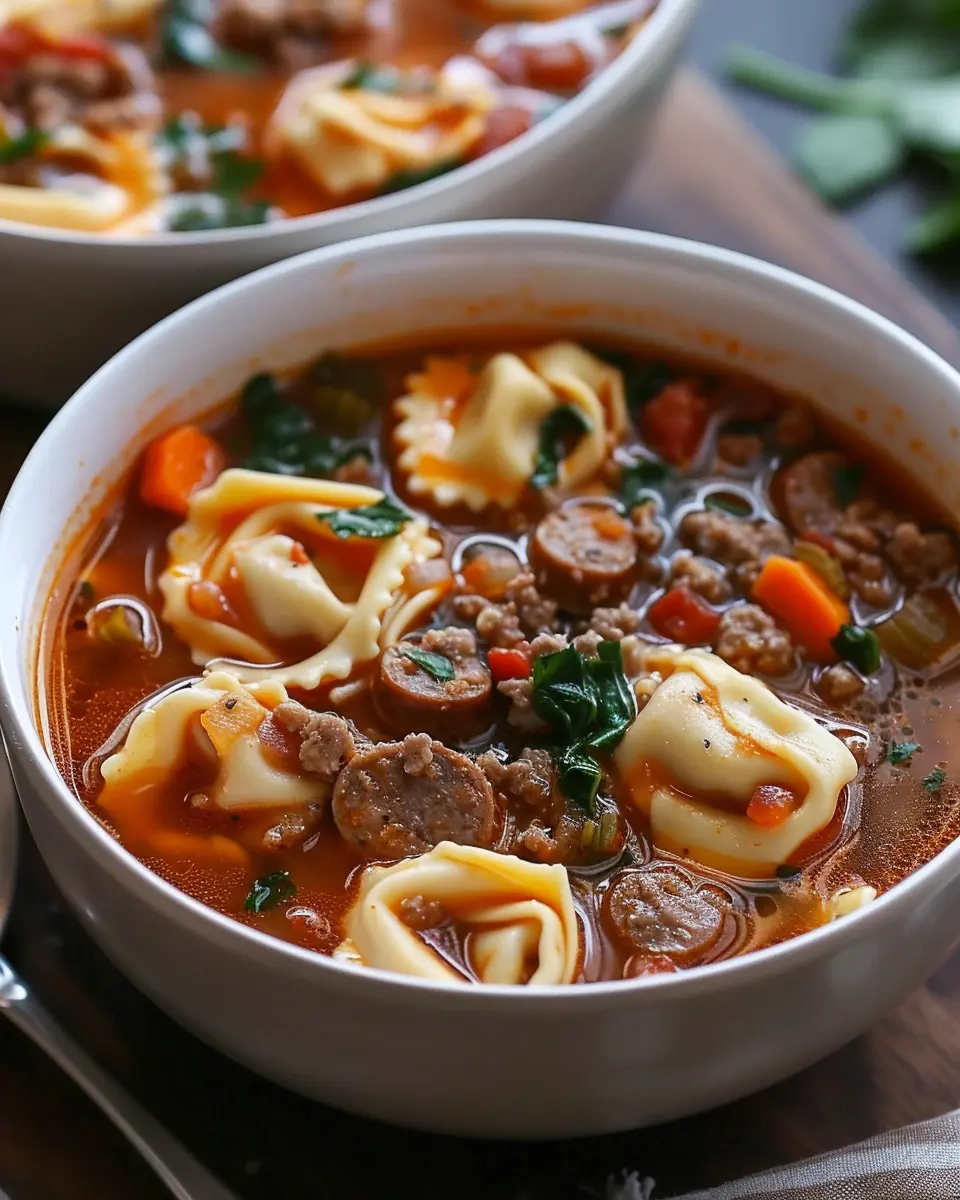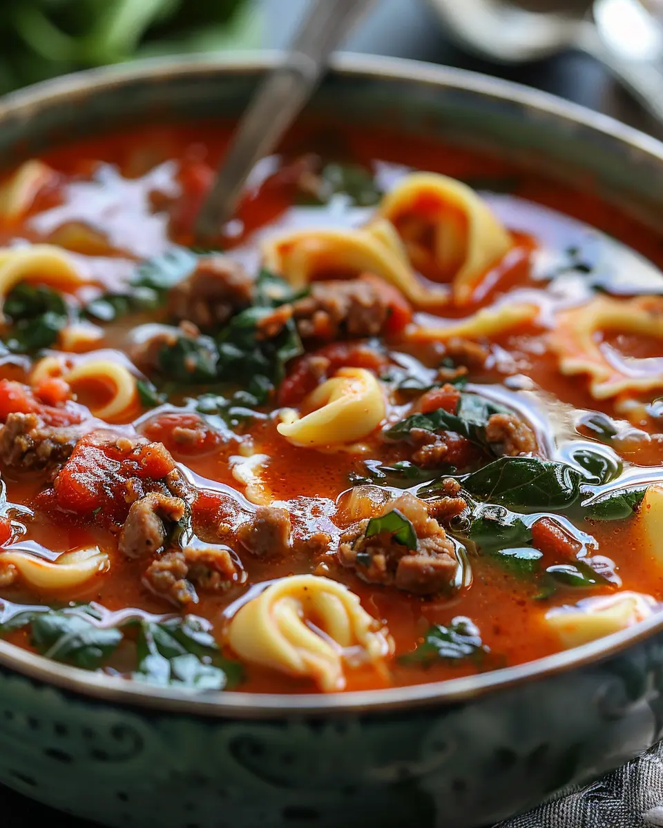 A warm and hearty soup made with tortellini and sausage, perfect for a comforting meal.