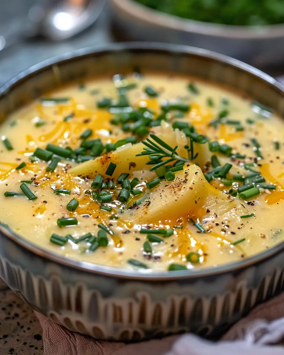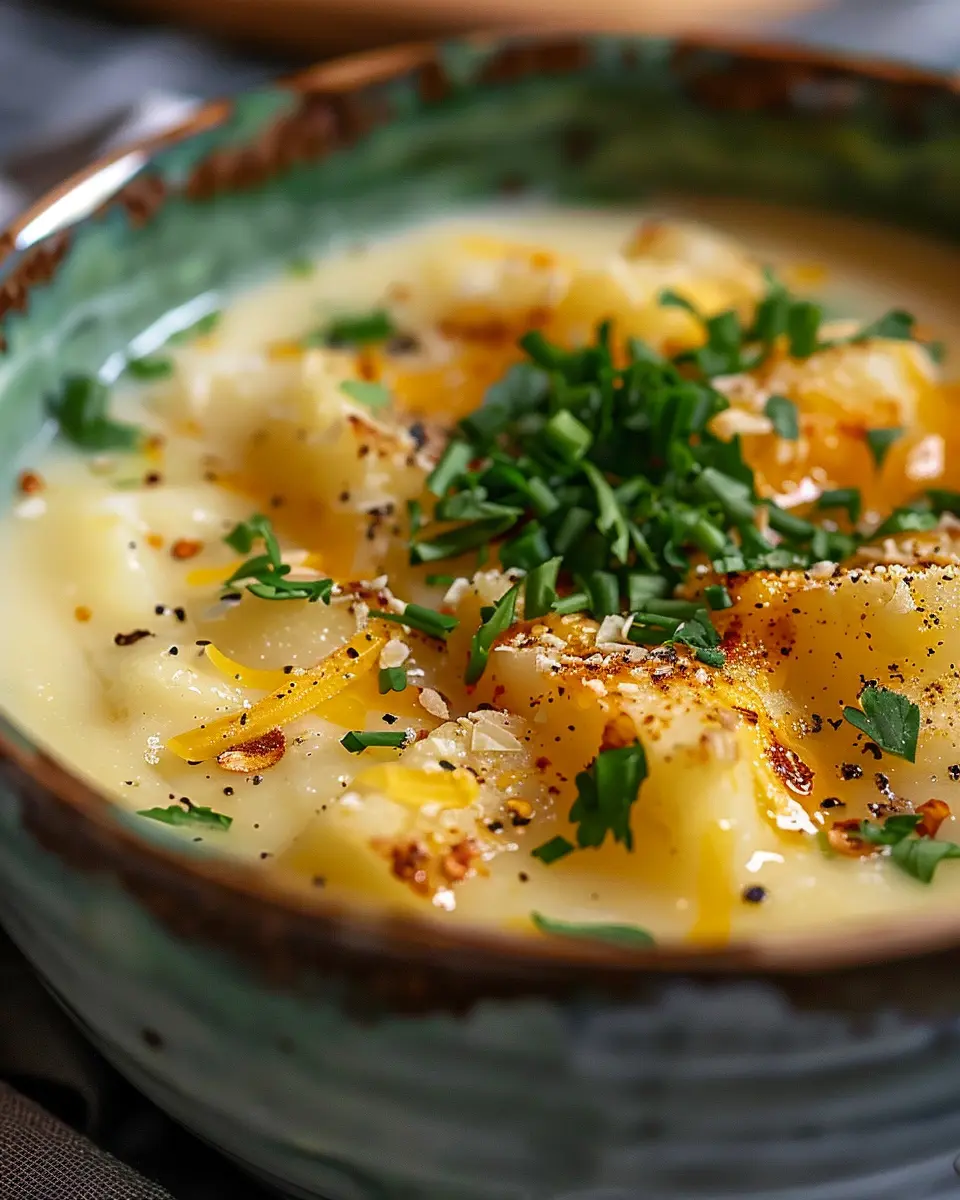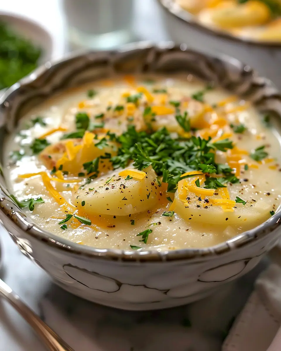 A cozy and flavorful potato soup enriched with cheddar cheese, garlic, and herbs that is perfect for chilly evenings.