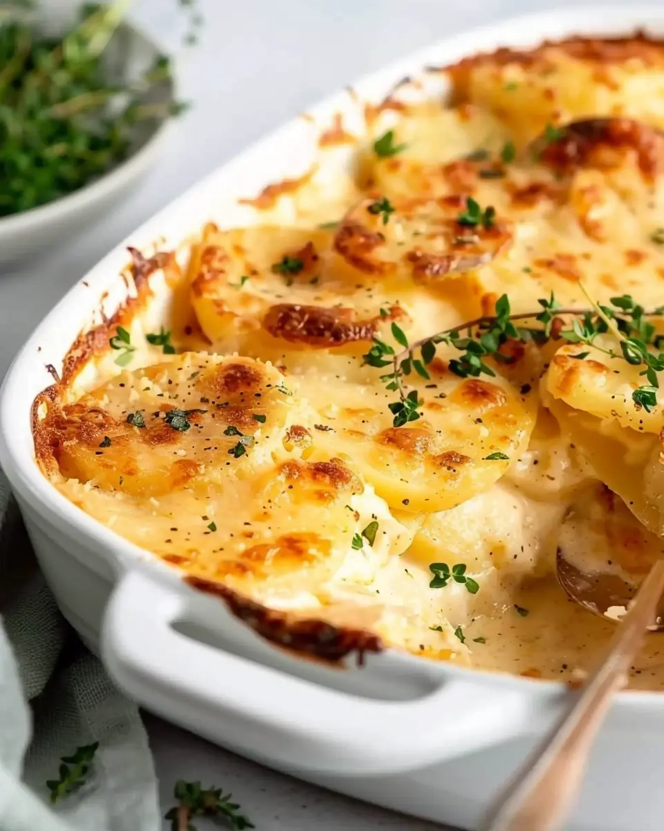 Looking to lighten things up? These scalloped potatoes also pair wonderfully with seared salmon or a vibrant mixed greens salad, allowing you to strike the right balance of flavors.