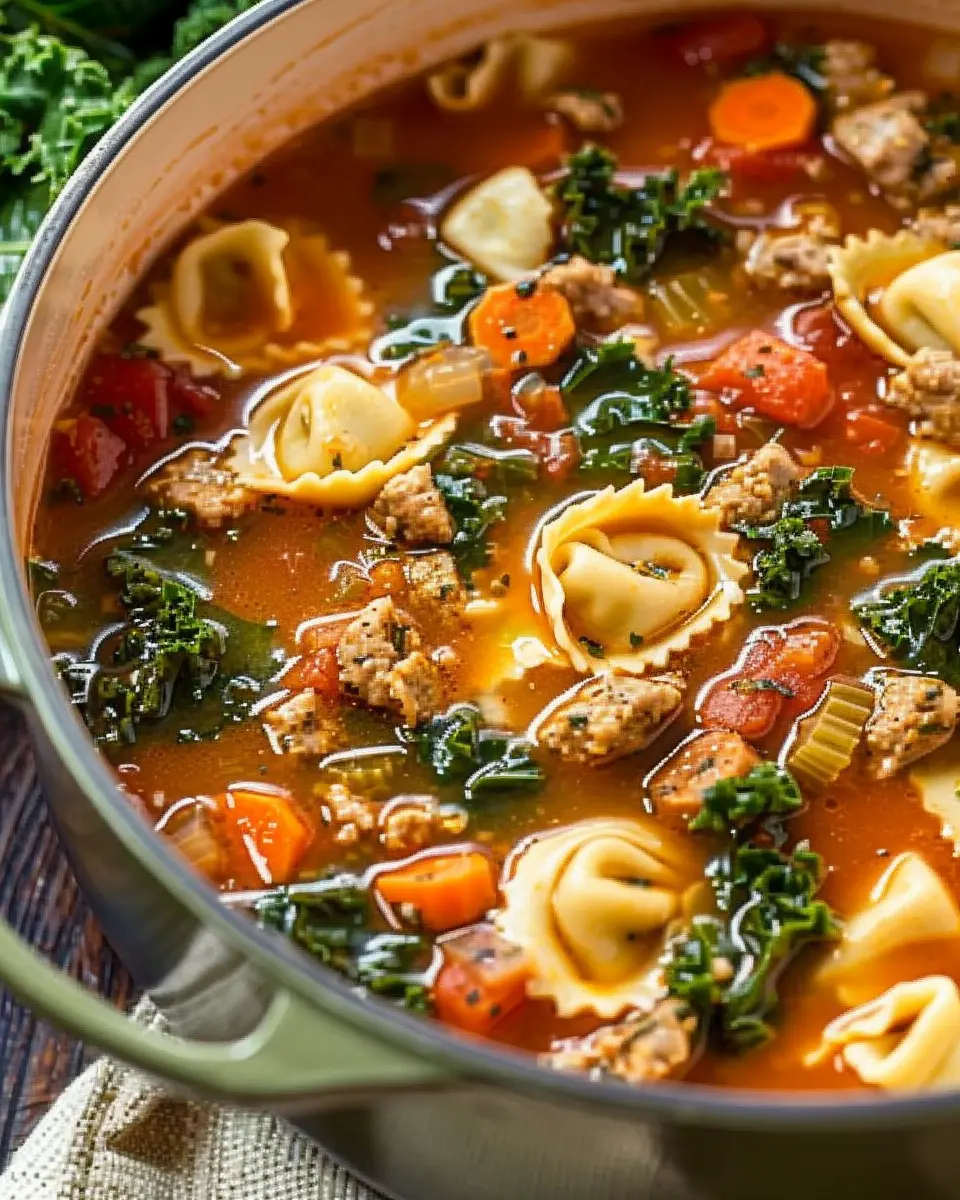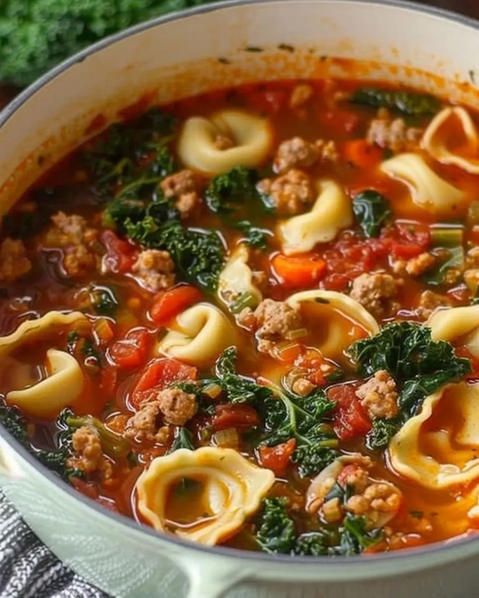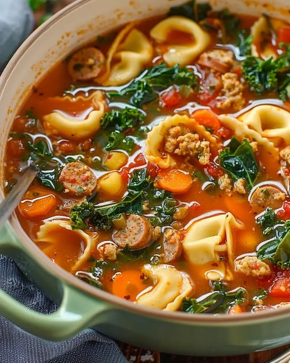 A comforting bowl of Italian sausage, kale, and tortellini soup, perfect for chilly days.