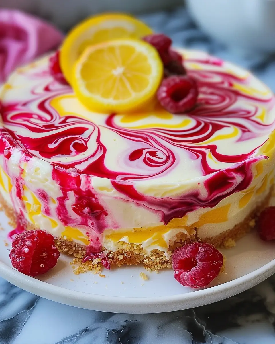 A delicious and creamy lemon raspberry swirl cheesecake perfect for home chefs seeking a delightful dessert.