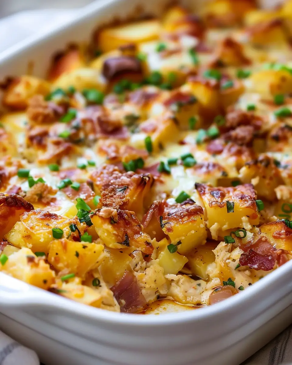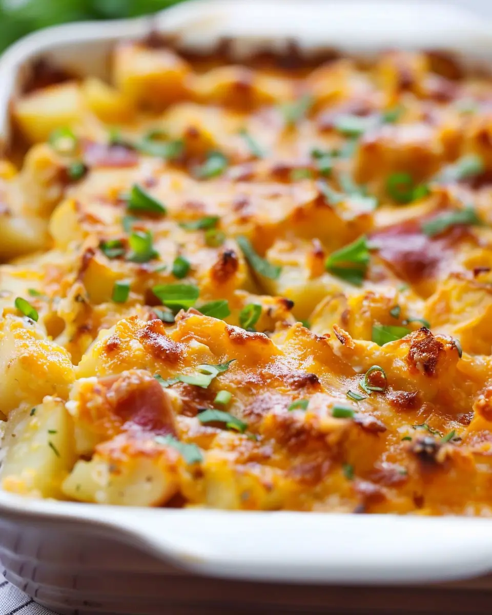 The Loaded Chicken and Potato Casserole is more than just a dish; it’s a culinary experience that encapsulates all the cozy, satisfying flavors that we love. At its core, this casserole layers tender chicken (think shredded or cubed chicken ham) with golden, perfectly roasted potatoes. To enhance this tasty base, we then add a mix of toppings like Turkey Bacon, melted cheese, and fresh herbs that create a beautiful medley of textures and flavors.