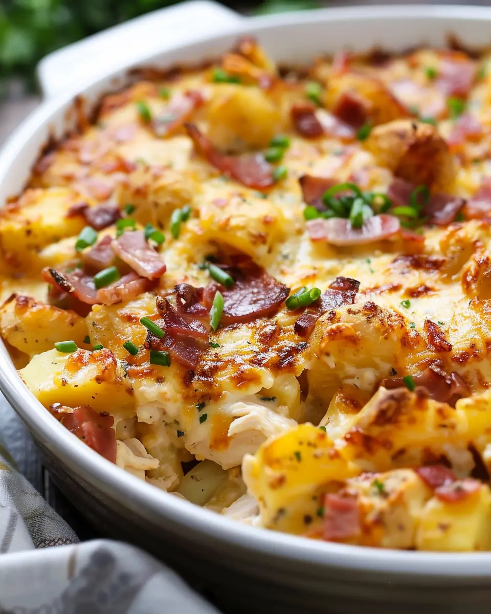This Loaded Chicken and Potato Casserole with Turkey Bacon is a comforting dish that combines savory flavors and hearty ingredients.