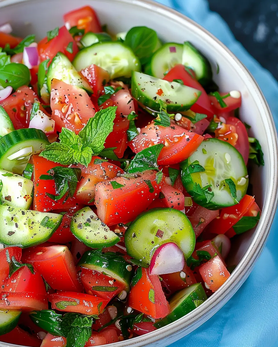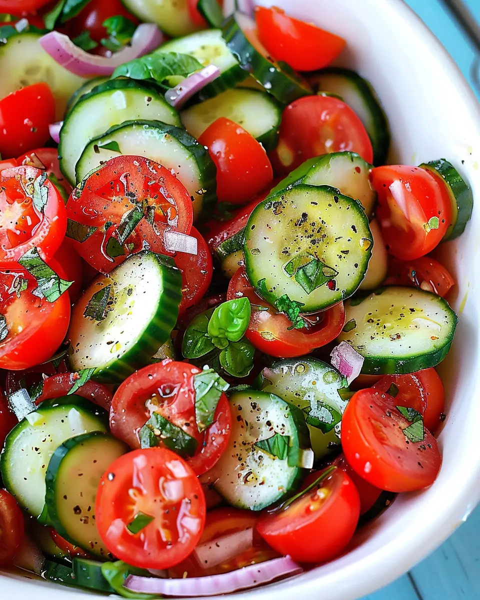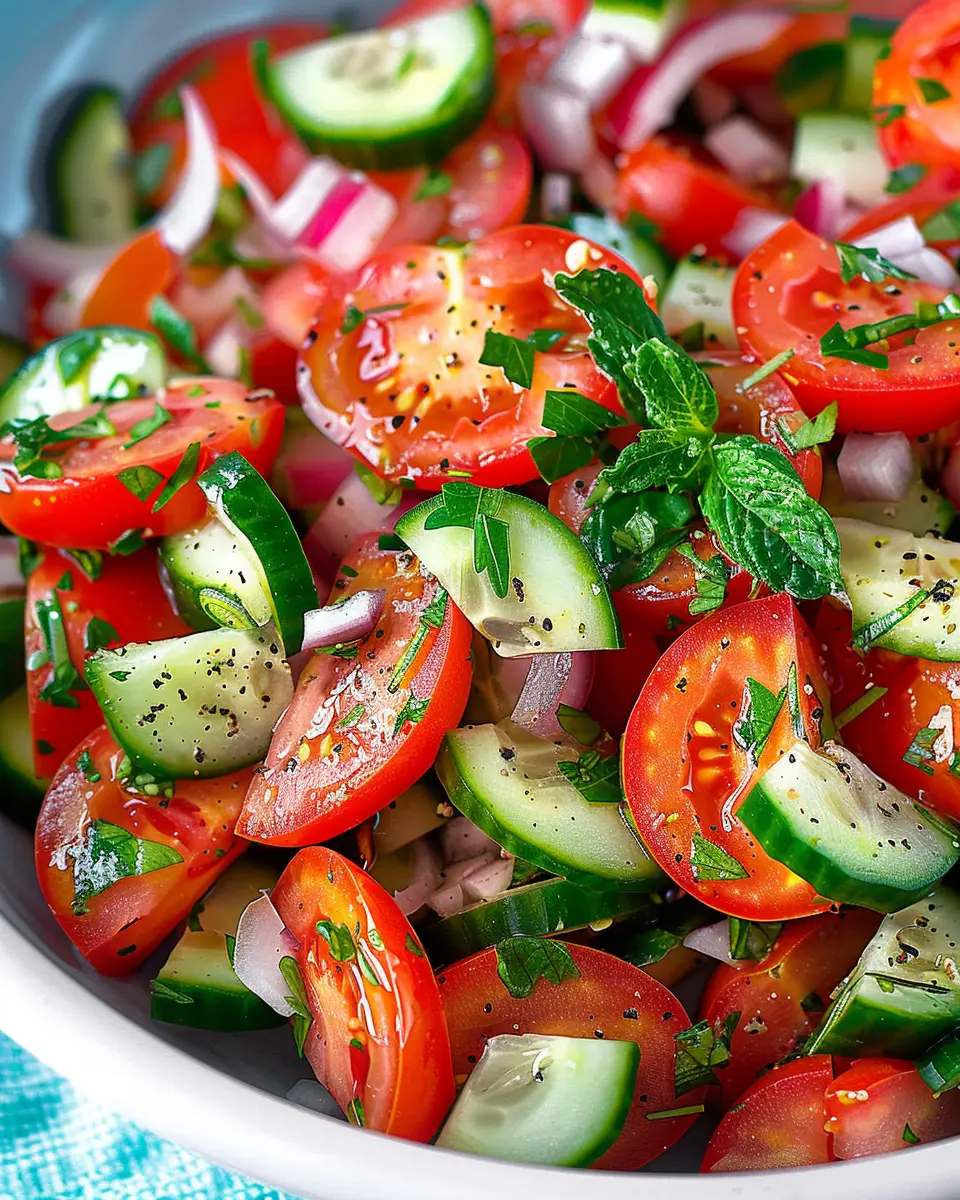 A light and refreshing salad featuring fresh tomatoes and cucumbers, perfect for warm weather.