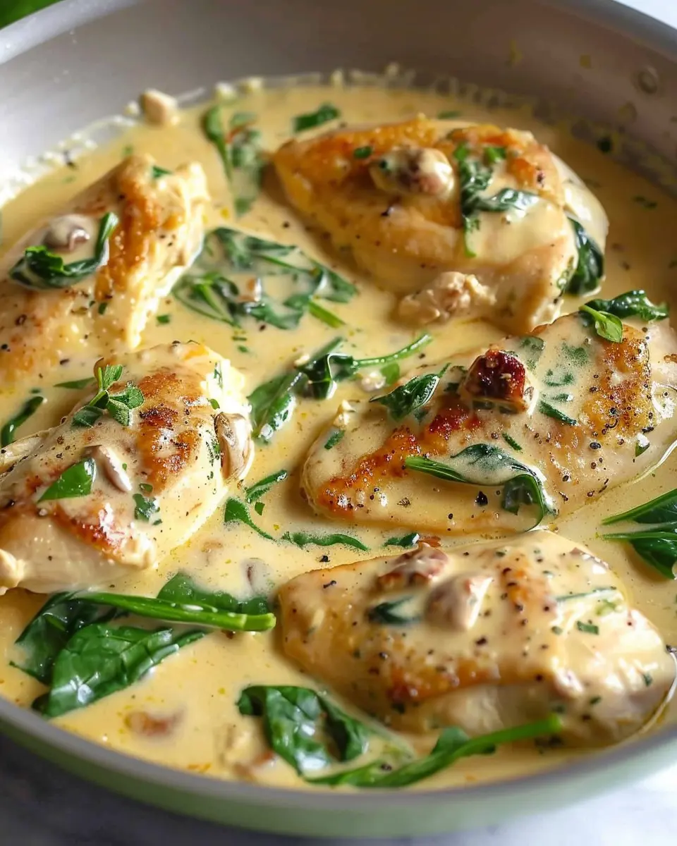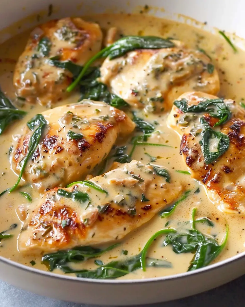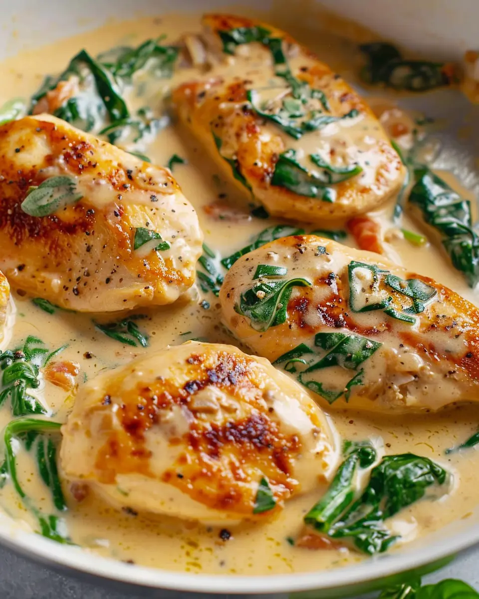 A rich and creamy one-pan dish that combines tender chicken and fresh spinach, perfect for a quick weeknight dinner.