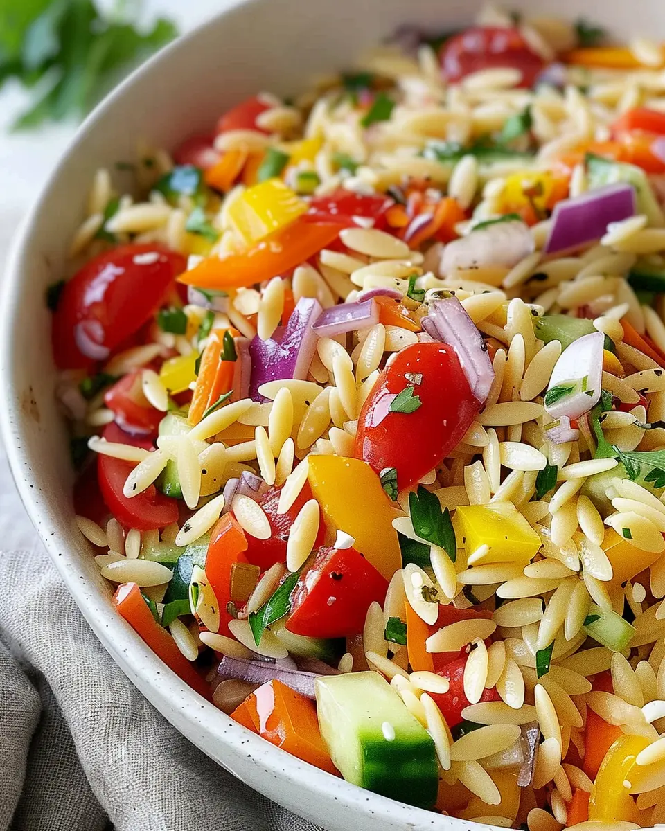 PrintRainbow Orzo Salad: A Colorful and Easy Dish for Every Occasion