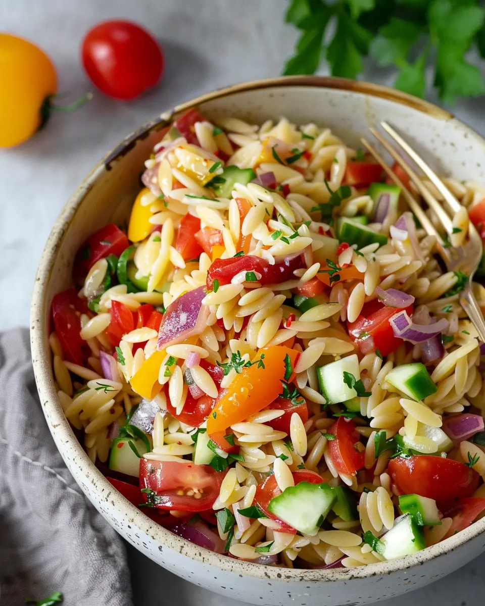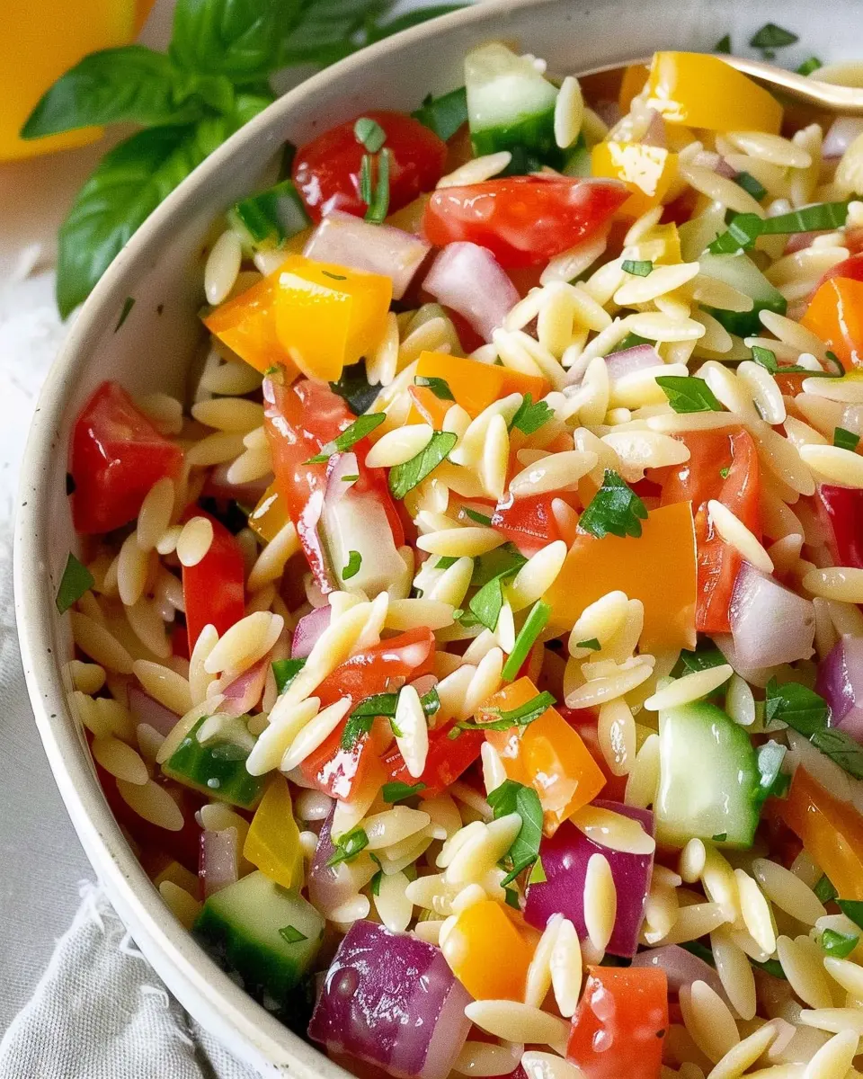 Besides being visually stunning, each ingredient contributes not only to the taste but also to the health benefits. For instance, bell peppers are rich in vitamins A and C, which can boost your immune system, while whole-grain orzo offers a hearty dose of fiber. According to the Mayo Clinic, incorporating a variety of colorful vegetables into your diet can result in better overall health, making this salad an excellent choice for both your taste buds and your health.