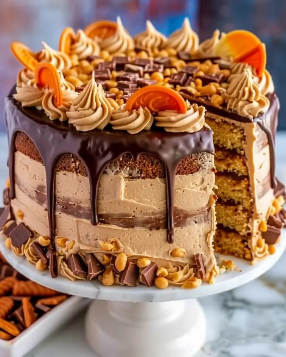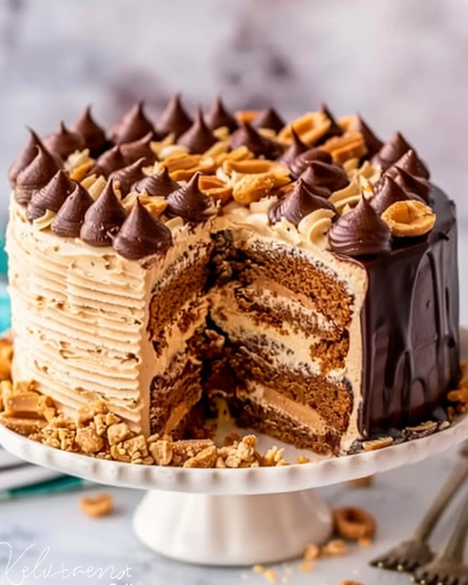 A delicious and indulgent cake combining the rich flavors of chocolate and peanut butter, perfect for any celebration.