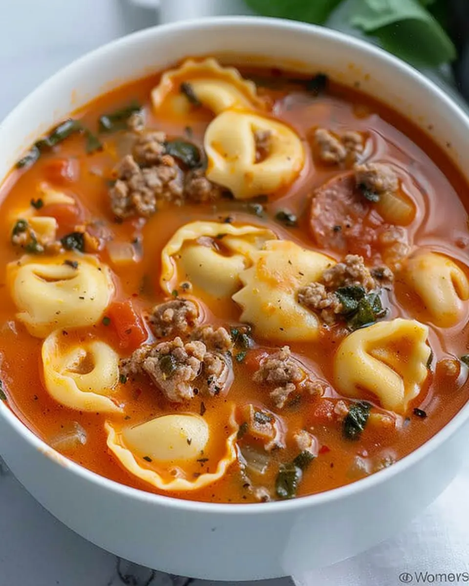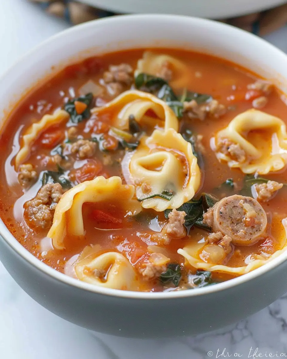 Enjoy a warm bowl of Sausage and Tortellini Soup, a delightful dish that combines savory sausage and tender tortellini in a flavorful broth.