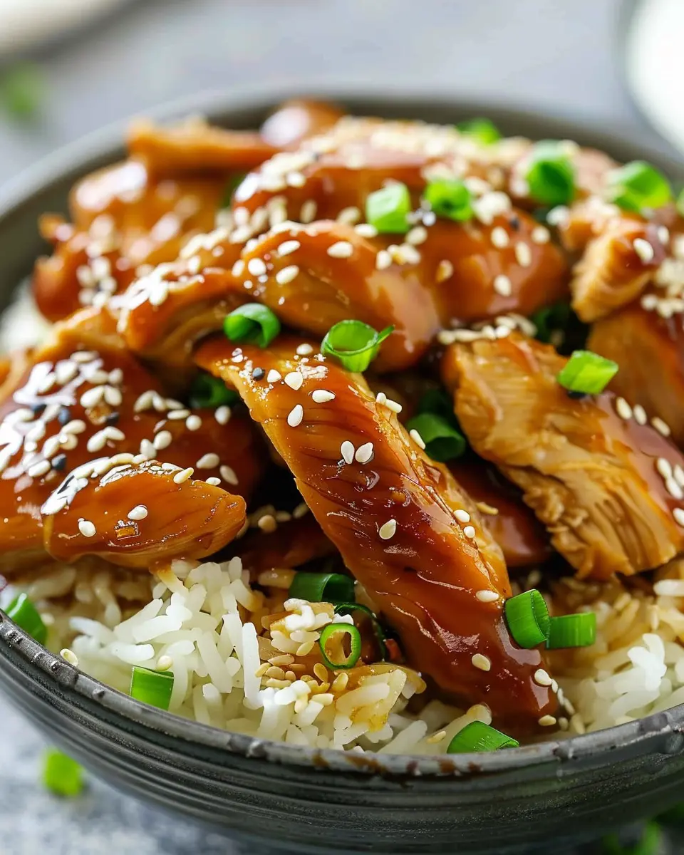 Serve your now-shredded chicken over a bed of rice, drizzle with the thickened sauce, and top with sesame seeds and chopped green onions for a beautiful, delicious finish!