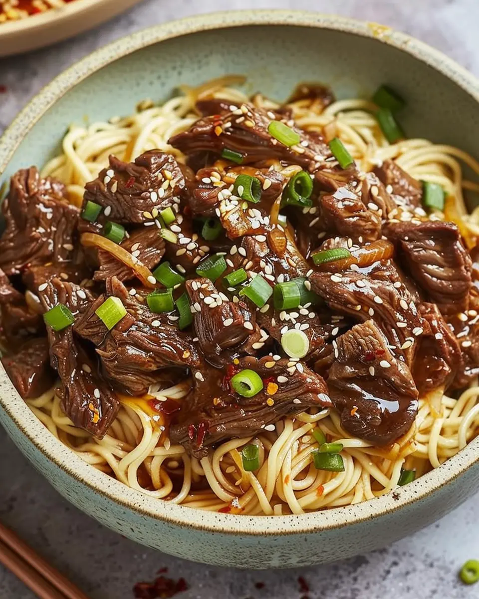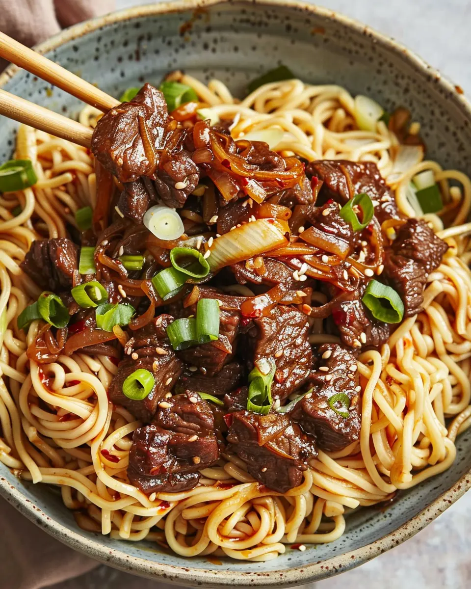Next, combine the cooked noodles with the tender beef and sauce in a large mixing bowl, ensuring everything is well-coated. You might want to add some chopped green onions or sesame seeds on top for a fresh and crunchy garnish.
