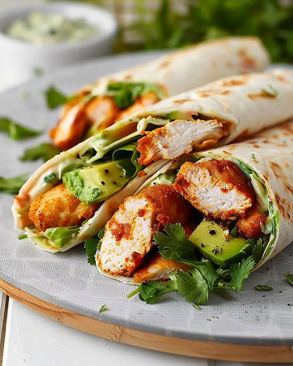 - Add lettuce, chicken tenders, and avocado slices to tortillas.
