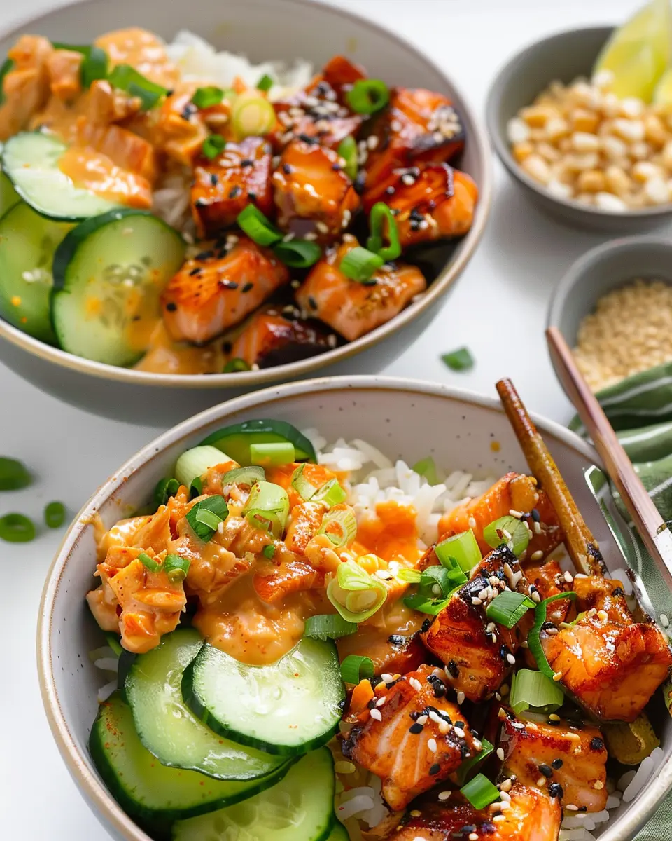 Toppings can transform your sweet & spicy salmon rice bowls into a vibrant dish. Some favorites include: