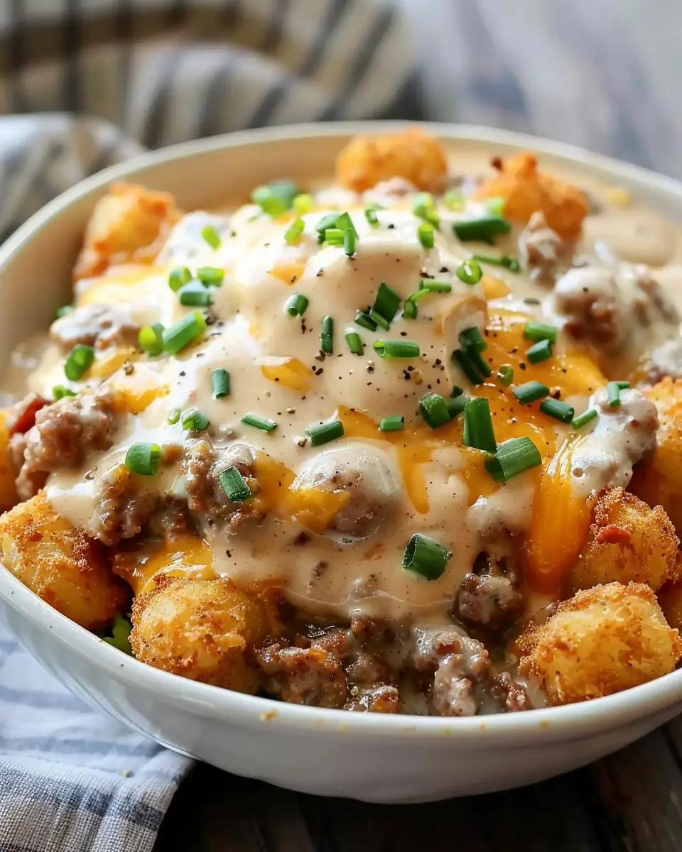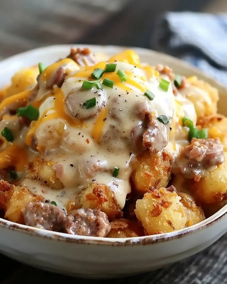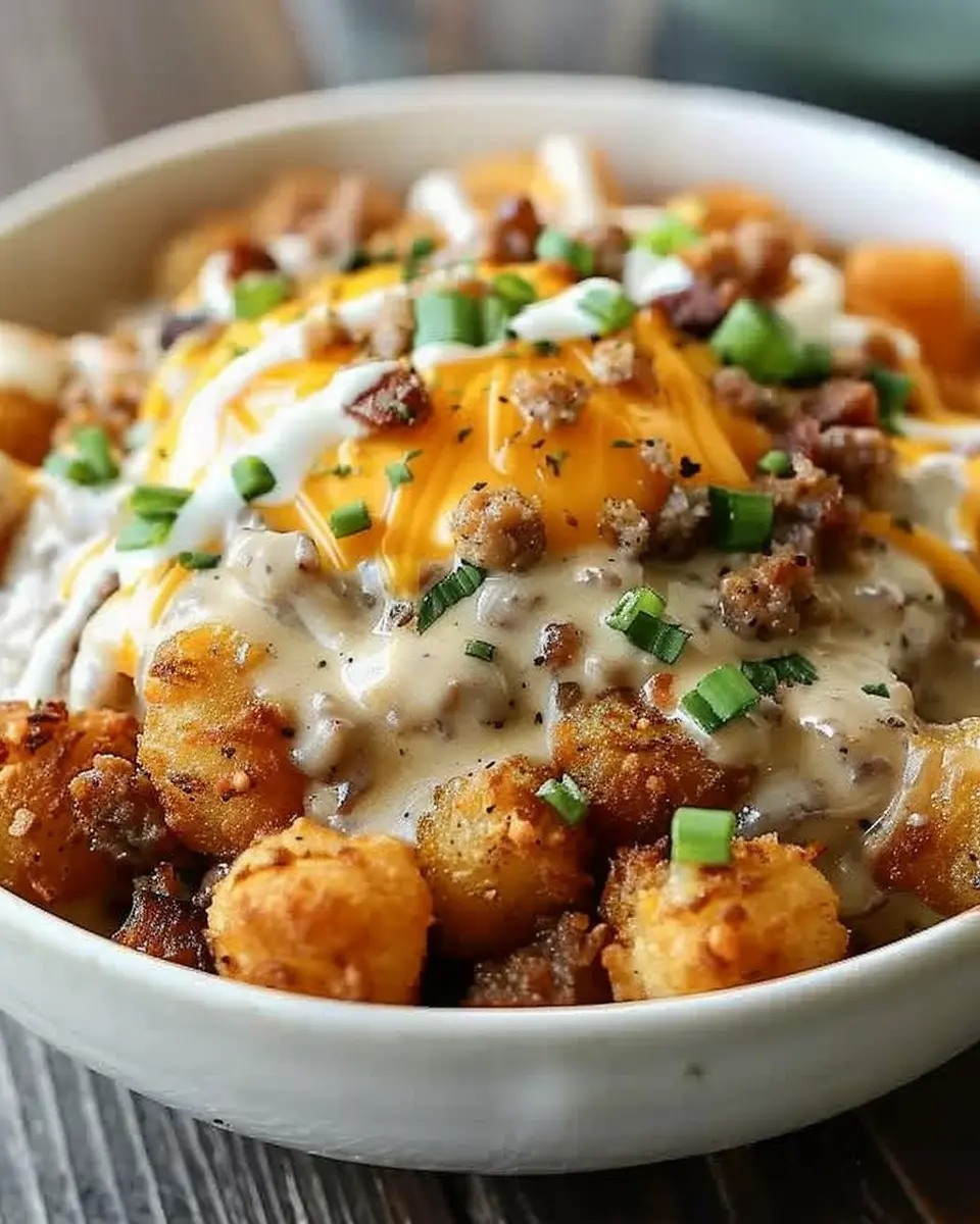 A hearty and indulgent breakfast bowl featuring crispy tater tots smothered in savory sausage gravy.